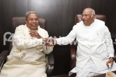 Photo Caption : AICC President candidate Mallikarjuna Kharge and CLP leader, Former CM Siddaramaiah after casting their vote for the AICC President election at KPCC office, in Bengaluru on Monday 17th October 2022