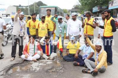 Photo Caption : KRS, AAP and Kannada Activists protesting against pothole road in the city, at Vatal Nagaraj Road, Okalipuram, in Bengaluru on Monday 17th October 2022