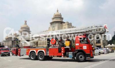 Photo Caption : A fire tender equipped with the newly introduced 90 mtr ladder at Vidhana Soudha, in Bengaluru on Thursday 20th October 2022