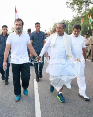 Photo Caption : Congress leader Rahul Gandhi with CLP leader, Former CM Siddaramaiah and Congress leaders during Congress Bharat Jodo Yatra, in Raichur District on Saturday 22nd October 2022