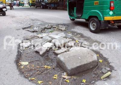 Photo Caption : Pothole roads at Millers Road near Jain Hospital, and has been causing major inconvenience to people and motorists, in Bengaluru on Monday 24th October 2022