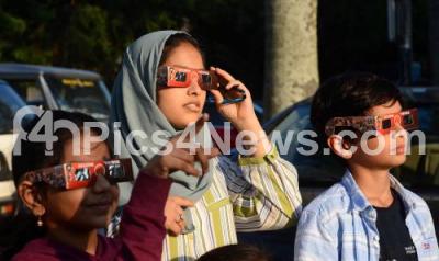 Photo Caption : People watching partial solar eclipse wearing protective glasses at Planetarium, in Bengaluru on Tuesday 25th October 2022