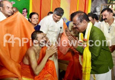 Photo Caption : Udupi Palimar Mutt Sri Vidyadhisathirtha Sripada with Sri Dr Shivananda Shivayogi Rajendra Mahaswamiji of Kodi Mutt and others during Mahakumbhabhisheka Mahotsava of Sri Kadumallikarjuna Swami temple at Malleshwaram, in Bengaluru on Sunday 6th November 2022