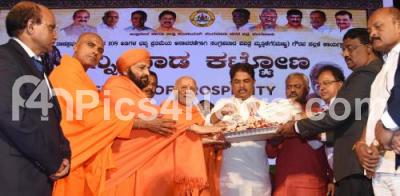 Photo Caption : Minister ST Somashekar, Sri Kumara Chandrashekaranatha Swamiji, Ramananda Swamiji, MLA A Devegowda, MP Bachechegowda and others during the tribute to holy mud campaign at Town Hall, for the development work of statue of Nadaprabhu Kempegowda at Bengaluru International Airport, in Bengaluru on Tuesday 8th November 2022