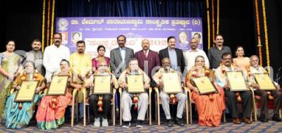 Photo Caption : Justice KN Phaneendra presenting "Samskruti Siri - 2022" awards during award presentation program organized by Dr. Vemgal Narayanswamy Samskrutika Pratistana, also seen are IM Vittalamurthy, IAS (Retd.), Dr. Vemgal Narayanswamy, President, Dr. Vemgal Narayanswamy Samskrutika Pratistana and others, at Ravindra Kalakshetra , in Bengaluru on Sunday 20th November 2022