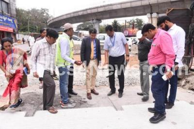 BBMP Commissioner Tushar Girinath inspects the work in progress of Rapid Road (Freecast Post Tensioning Concrete Pavement) experimentally constructed for a 500 meter long road with innovative technology near New Binnamangala Circle on Old Madras Road in the city, in Bengaluru on Wednesday 23rd November 2022