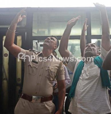 Photo Caption : Police and farmers convincing sugarcane farmer Chandrappa from Channapatna who climbed up the tree in attempt to commit sucide at Maharani college campus, during sugarcane farmers protest and demanding to solve the pricing problem of Sugarcane, in Bengaluru on Friday 25th November 2022