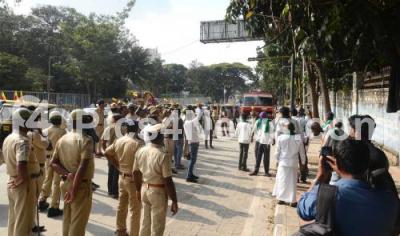 Police and farmers convincing sugarcane farmer Chandrappa from Channapatna who climbed up the tree in attempt to commit sucide at Maharani college campus, during sugarcane farmers protest and demanding to solve the pricing problem of Sugarcane, in Bengaluru on Friday 25th November 2022