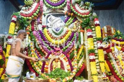 Photo Caption : A priest performing special pooja on the occasion of Hanuman Jayanti, at Maruthi Temple, in Bengaluru on Monday 5th December 2022