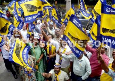 Members of Aam Aadmi Party celebrating after party victory in the Municipal Corporation of Delhi (MCD) at AAP party office, in Bengaluru on Wednesday 7th December 2022