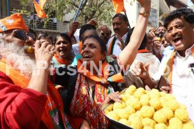 Photo Caption : BJP workers celebrating after victorious in the Gujarat Assembly election at BJP party office, in Bengaluru on Thursday 8th December 2022