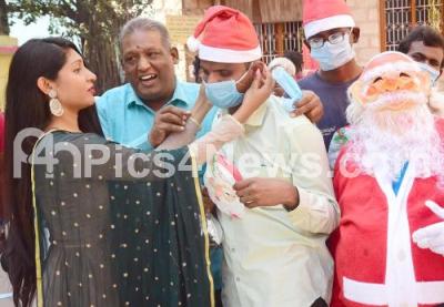 Actress Amulya Gowda celebrated Christmas and New Year with blind and orphan children and distributed cakes and food to them, organized by Bharatinagar Citizens Forum, at Coxtown, in Bengaluru on Friday 23rd December 2022