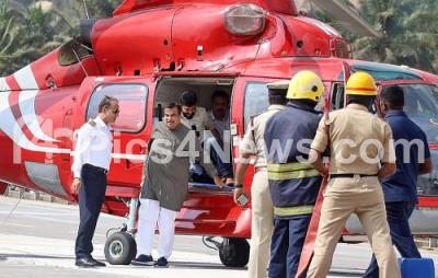 Photo Caption : Union Transport Minister Nitin Gadkari arrives in a helicopter to inspect the progress of the Bengaluru - Mysuru Expressway, in Ramanagar on Thursday 5th January 2023