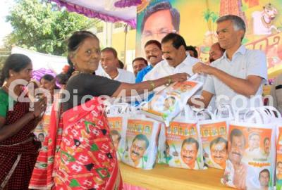 Former Minister and MLA Krishna Byre Gowda and MLA Akhanda Srinivasa Murthy distributing ration kit on the eve of Sankranti festival at Pulikeshi Nagar constituency, in Bengaluru on Thursday 12th January 2023