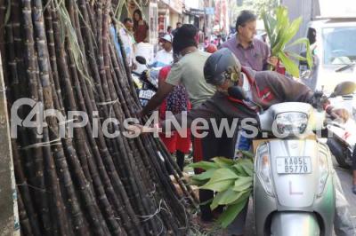 People shopping Sugarcane, flowers, ellu bella (sesame seeds) bella (jaggery)) items ahead of "Sankranti" (pongal) festival at Malleshwaram, in Bengaluru on Saturday 14th January 2023