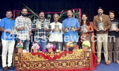 Photo Caption : Film Song Writer V Nagendra Prasad releasing a book titled "Manada Chippali Birida Muttugalu" with writer Janagere Venkataramaiah, Bengaluru City Zilla Kannada Sahitya Parishat President, M Prakash Murthy, Book Author Roopa and others at Kannada Bhavan , in Bengaluru on Saturday 14th January 2023