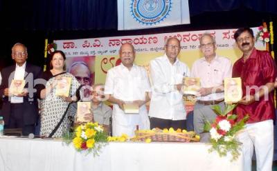 Photo Caption : Nadoja Dr. TV Venkatachala Shastri releasing a book titled "Kannada Pradana" during a felicitation programe to Dr. PV Narayan on his 80th birthday celebrations organised by Dr. PV Narayana Felicitation Commitee at Udayabanu Kala Sangha, also seen are Nadoja Dr. Hampa Nagarajaiah, Dr. Byramangala Ramegowda, Dr. R Lakshminarayana and others, in Bengaluru on Sunday 29th January 2023