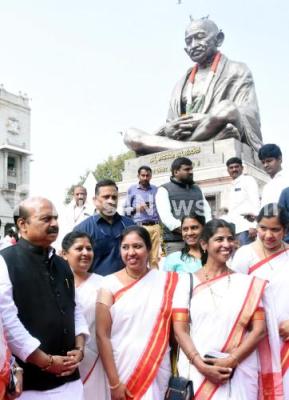 Event Description : Chief Minister Basavaraj Bommai with Minister Sudhakar and MLA CT Ravi pay floral tribute to Mahatma Gandhi portrait during Sarvodaya Day (Martyrs Day) at Vidhana Soudha, in Bengaluru on Monday 30th January 2023