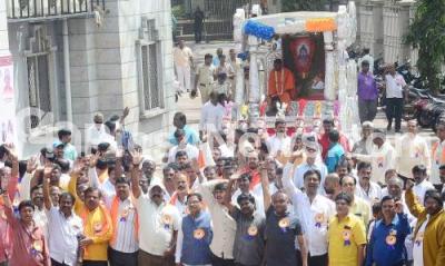 Photo Caption : Savithanand Natha Swamiji with Savitha Samaja Community leaders Krishna Murthy, Narasimhaiah, Nagaveni and others during the inauguration of Savitha Maharshi Jayanti organised by Kannada and Culture Dept at Kannada Bhavan, in Bengaluru on Tuesday 31st January 2023