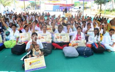 Photo Caption : Members of state health, family welfare and medical education department contract and outsourcing employees protest demanding enforcement of equal pay for equal work at freedom park, in Bengaluru on Tuesday 7th February 2023