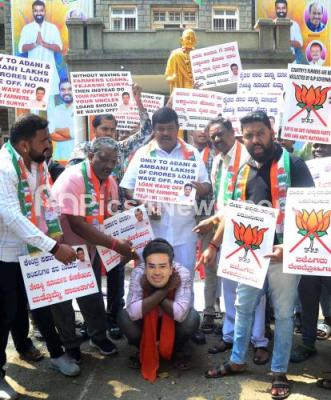 Photo Caption : Members of Congress protest against BJP MP Tejashwi Surya on his statement at congress bhavan , in Bengaluru on Wednesday 8th February 2023