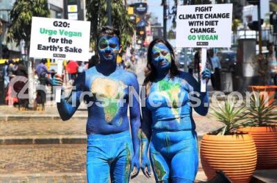 Photo Caption : Volunteers of PETA duo body painted as earth to appeal to G20 to fight climate catastrophe with vegan foods at War Memorial brigade road, in Bengaluru on Friday 10th February 2023