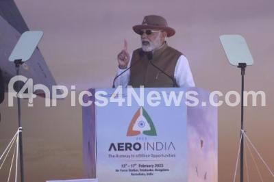 Photo Caption : PM Narendra Modi addressing during the inauguration of Aero India 2023 at Yelahanka Air Base , in Bengaluru on Monday 13th February 2023