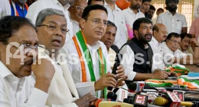Photo Caption : Karnataka Congress leaders Siddaramaiah, AICC General Secretary and Karnataka incharge Randeep Singh Surjewala, Congress leader G Parameshwar and other leaders addressing a press conference at KPCC Office, in Bengaluru on Monday 20th February 2023