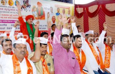 Basava Jaya Mrityuanjaya Swamiji from Kudalasangama Panchamashali Peeta along with community members raise slogans during a sit in protest, demanding reservation for Panchamshali under 2A category, at Freedom Park, in Bengaluru on Wednesday 22nd February 2023