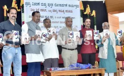 Photo Caption : Mallepuram G Venkatesh with Prajavani Editor Ravidnr a Bhatta, theatre Artist Babu Heerannaiah, Karmaveera Editor Anil Kumar, Writer CN Krishnamurthy and others during release of Kannada books “Maasti Sahitya Parichaya” and “Nillu Nille Patanga” at Kannada Sahitya Parishat, in Bengaluru on Sunday 26th February 2023