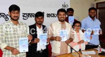 Photo Caption : Zushan Aaqil Siddique, President Students Islamic Organization, Mohammed peer, Secretary Students Islamic Organization, Chandru Periyar, Student union leader, Pooja and Mohammad Naseer, General Secretary during the release of student Manifesto by Students Islamic Organization at Legislative House, in Bengaluru on Friday 3rd March 2023