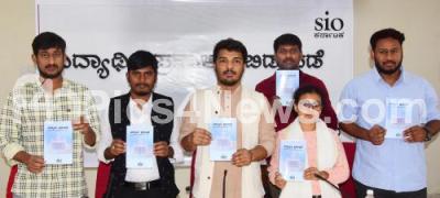 Photo Caption : Zushan Aaqil Siddique, President Students Islamic Organization, Mohammed peer, Secretary Students Islamic Organization, Chandru Periyar, Student union leader, Pooja and Mohammad Naseer, General Secretary during the release of student Manifesto by Students Islamic Organization at Legislative House, in Bengaluru on Friday 3rd March 2023