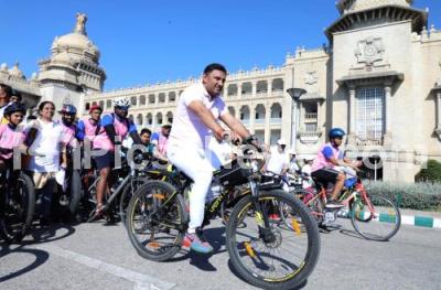 Photo Caption : Minister Sudhakar participated in bicycle rally ahead of International Womens Day at Vidhana Soudha, organised by Health and Family Welfare Dept, in Bengaluru on Sunday 5th March 2023