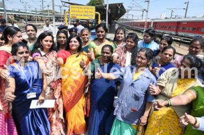Photo Caption : J Fathina, Saraswathi and Prathima Sharma, Station Master and others flagged off the Bengaluru Mysuru Express at City Railway Station which operated with all women crew, on the occasion of International Womens Day celebrations, in Bengaluru on Wednesday 8th March 2023