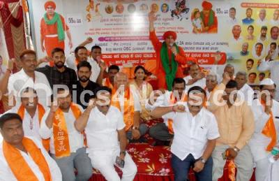 Photo Caption : Basava Jaya Mruthyunjaya Swamiji from Kudalasangama Panchamashali Peeta, Congress Leader SR Patil along with community members raise slogans during a sit in protest, demanding reservation for Panchamshali under 2A category, at Freedom Park, in Bengaluru on Thursday 9th March 2023