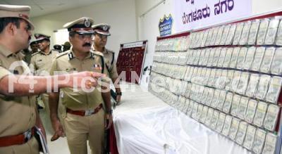 Police Commissioner Pratap Reddy and Police officials inspect the recovered weapons and valuables during property parade program at Police Commissioner Office, in Bengaluru on Saturday 11th March 2023