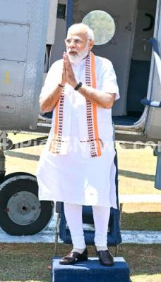 Photo Caption : Prime Minister Narendra Modi arrived to the inauguration of the Bengaluru-Mysuru Express highway and laying foundation stone of Mysuru - Kushalnagar highway, in Mandya district on Sunday 12th March 2023