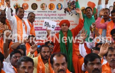 Photo Caption : Basava Jaya Mruthyunjaya Swamiji from Kudalasangama Panchamashali Peeta, along with community members raise slogans during a sit in protest, demanding reservation for Panchamshali under 2A category at Freedom Park, in Bengaluru on Monday 13th March 2023