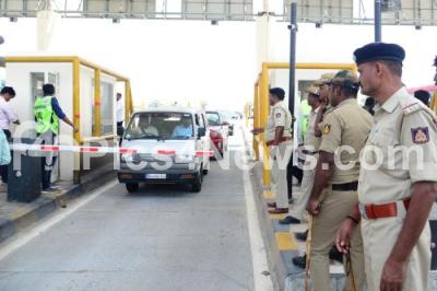 Police tight security at Bengaluru Mysuru Expressway toll, Seshagiri Halli ,following various organisations protest against the toll rate and not clearing service road work,, toll charges started from today after Bengaluru - Mysuru Expressway inaugurated by Prime Minister Narendra Modi on 12th March, in Bengaluru on Tuesday 14th March 2023