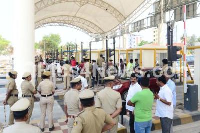 Photo Caption : Police tight security at Bengaluru Mysuru Expressway toll, Seshagiri Halli ,following various organisations protest against the toll rate and not clearing service road work,, toll charges started from today after Bengaluru - Mysuru Expressway inaugurated by Prime Minister Narendra Modi on 12th March, in Bengaluru on Tuesday 14th March 2023