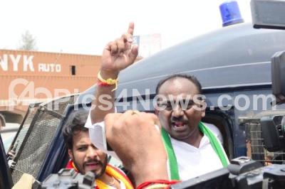 Photo Caption : JDS leaders and party workers led by JDS Youth State President Nikhil Kumarswamy staged a protest against the toll rate and not clearing service road work at Bengaluru - Mysuru Expressway at Seshagiri Halli, in Bengaluru on Thursday 16th March 2023
