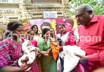 Poornima Rajkumar, Sister of Puneet Rajkumar with Kannada Actress Lasya, Model and Cine Star Aru and NS Ravi, President, Bharati Nagar Residents Forum during naming ceremony for the newly born babies as part of birth anniversary of Puneeth Rajkumar at Cox Town, in Bengaluru on Thursday 16th March 2023