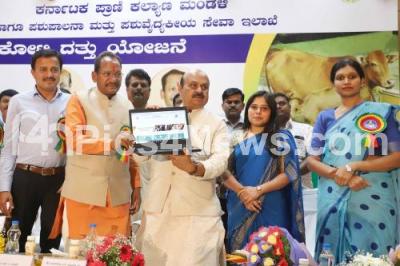 Photo Caption : Chief Minister of Karnataka Basavaraj Bommai during the launch of "Punyakoti Dattu Yojane" (Cow Adoption Scheme) during a program organized by Karnataka Animal Welfare Board and Department of Animal Husbandry and Veterinary Services, also seen are Prabhu Chavan, Minister of Animal Husbandry of Karnataka and others, in Bengaluru on Thursday 23rd March 2023