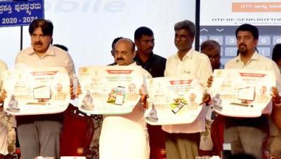 Photo Caption : Chief Minister Basavaraj Bommai launching the Bapuji Service Centre Software and Mobile app during presentation of Gandhi Grama Award at Palace Grounds, in Bengaluru on Friday 24th March 2023