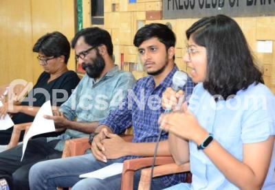 Lekha with Syed Junaid, Kishan and other members of All India Students Association (AISA) addressing a press conference on the Karnataka Governments unconstitutional decision to scrap reservation for Muslim OBCs at Bengaluru Press Club, in Bengaluru on Saturday 1st April 2023