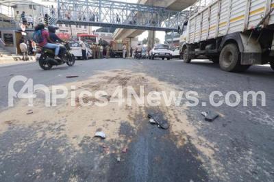 Photo Caption : Police at the Spot where the bus, lorry and two-wheeler met with an accident at Nyandanahalli, Mysuru road in which one died and two people were injured, in Bengaluru on Sunday 2nd April 2023