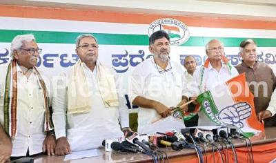 Photo Caption : BJP MLA NY Gopalakrishna joined congress party in the presence of KPCC President DK Shivakumar and Former CM Siddramaiah at KPCC office, in Bengaluru on Monday 3rd April 2023