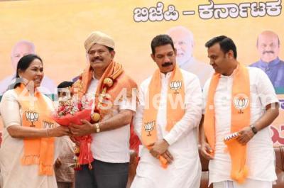 Photo Caption : Former JDS MLA AT Ramaswamy joined BJP party in the presence of Union Minister Shobha Karandlaje and State BJP President Nalin Kumar Kateel during the inauguration of the State level workshop of BJP Election Management Committee, at Palace Grounds, in Bengaluru on Monday 3rd April 2023