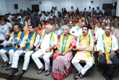 Photo Caption : Minister of Finance Nirmala Sitharaman, Union Minister Pralhad Joshi, CM Basavaraj Bommai, Former CM and BJP Senior Leader BS Yediyurappa, State President Nalin Kumar Kateel and BJP leaders during the BJP Samsthana Diwas (foundation day) at the Party office, in Bengaluru on Thursday 6th April 2023