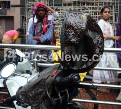 A devotee trying to douse the fire, where the vehicles were burnt due to camphor lit up by the devotees as part of the Bengaluru Karaga rituals in front of Dharmaraya temple, in Bengaluru on Thursday 6th April 2023